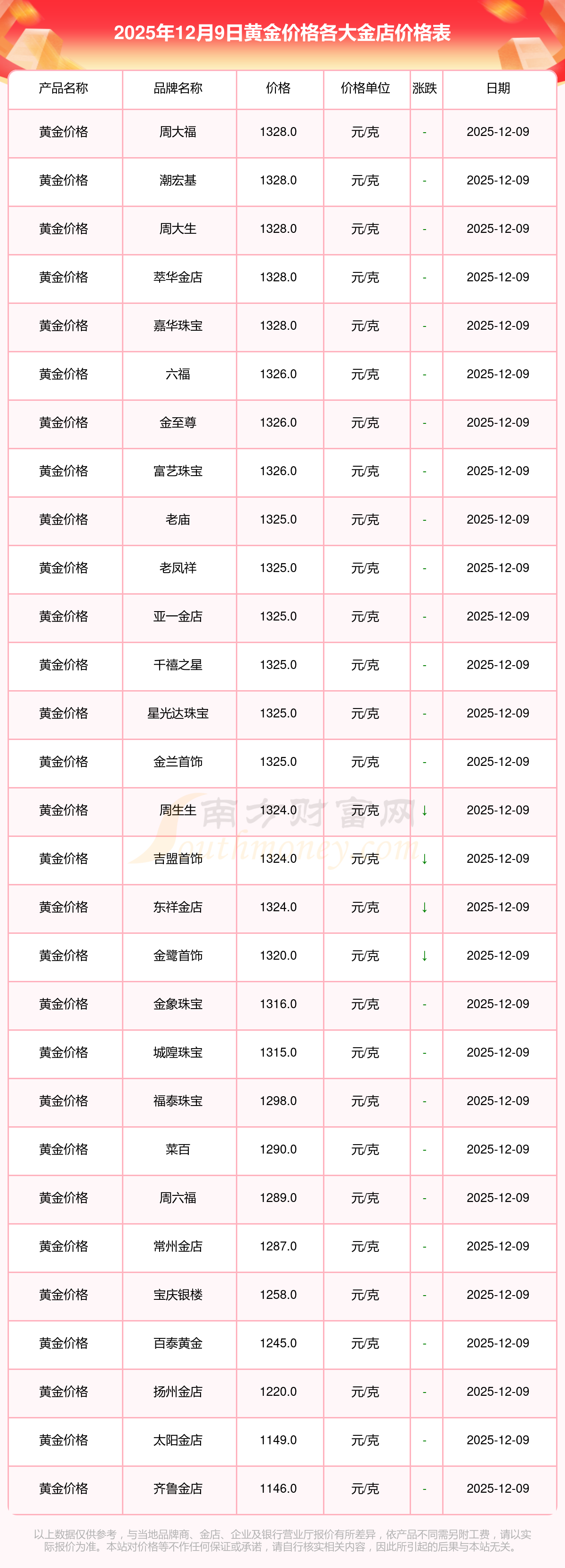 2025年12月9日各大金店黃金價(jià)格最新價(jià)格:周大福1328.0元/克,周大福669.0元/克,周大福1328.0元/克,周大福46520.0,周大福19190.0,周大福41960.0,周大福1165.0元/克,周六福1289.0元/克,周六福613.0元/克,周六福613.0元/克,周六福1184.0元/克。