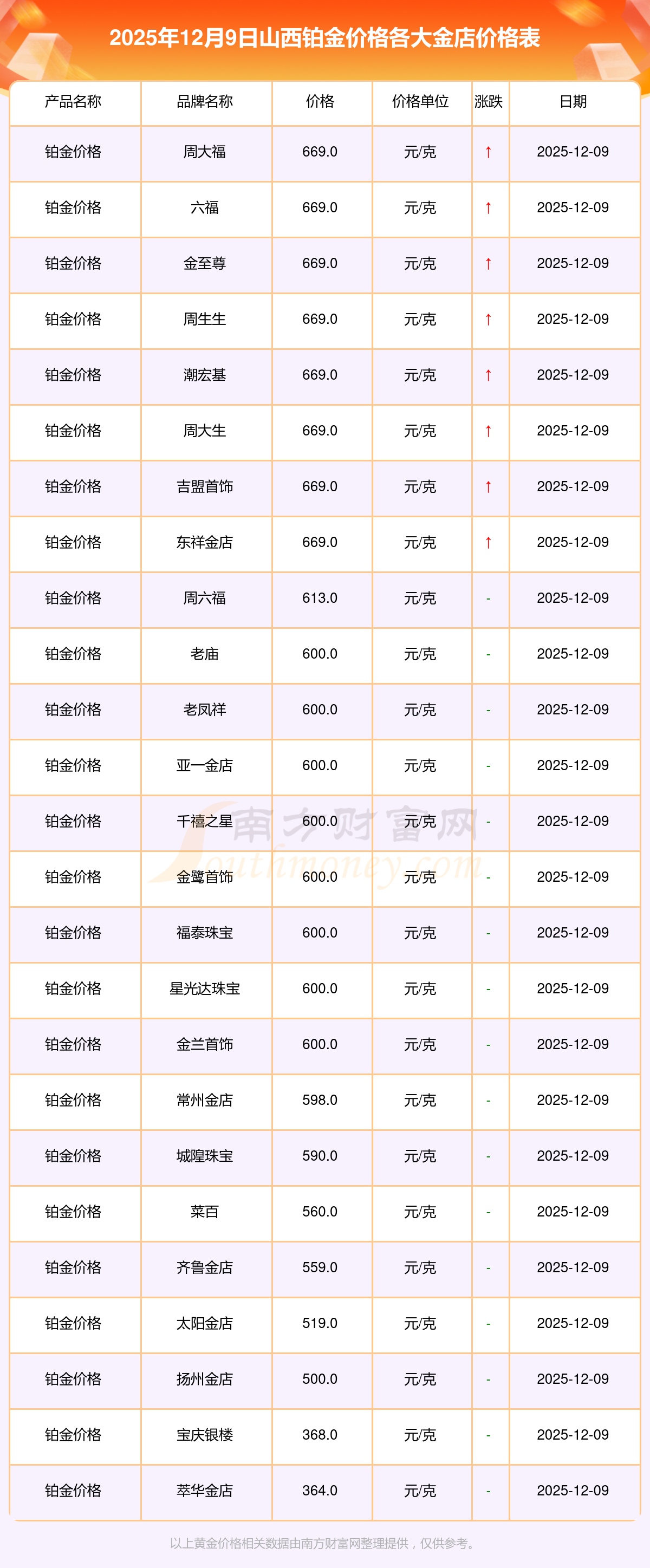 2025年12月9日山西周大福、周大福、周大福、周大福、周大福、周大福、周大福、周六福、周六福、周六福、周六福等各大金店品牌鉑金價(jià)格最新價(jià)格行情來了,如下:周大福黃金價(jià)格1328.0元/克,周大福鉑金價(jià)格669.0元/克,周大福飾品金價(jià)(內(nèi)地)1328.0元/克,周大福黃金飾品(香港)46520.0,周大福鉑金價(jià)格(香港)19190.0,周大福金條價(jià)格(香港)41960.0,周大福金條金價(jià)(內(nèi)地)1165.0元/克,周六福黃金價(jià)格1289.0元/克,周六福鉑金價(jià)格613.0元/克,周六福PT999鉑金價(jià)格613.0元/克,周六福金條價(jià)格1184.0元/克。