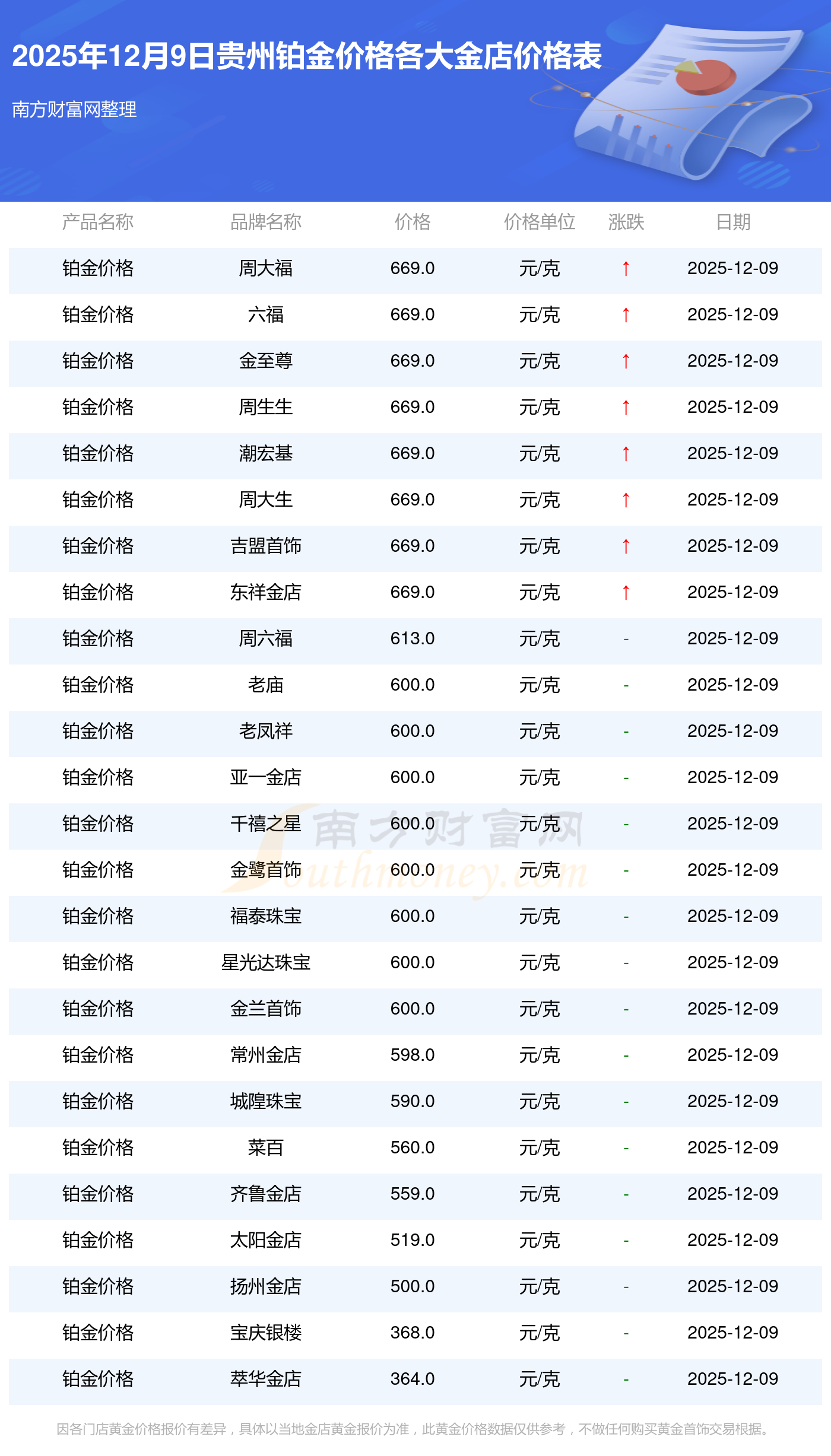 2025年12月9日貴州各金店鉑金價格多少一克呢(實時查詢表|最新報價|行情來了)