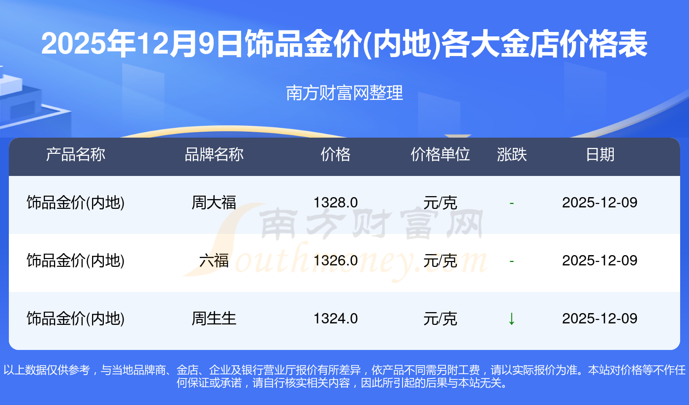 今天是2025年12月9日,周大福、周大福、周大福、周大福、周大福、周大福、周大福、周六福、周六福、周六福、周六福等各大金店品牌飾品金價(內(nèi)地)最新價格如下:周大福1328.0元/克、周大福669.0元/克、周大福1328.0元/克、周大福46520.0、周大福19190.0、周大福41960.0、周大福1165.0元/克、周六福1289.0元/克、周六福613.0元/克、周六福613.0元/克、周六福1184.0元/克。