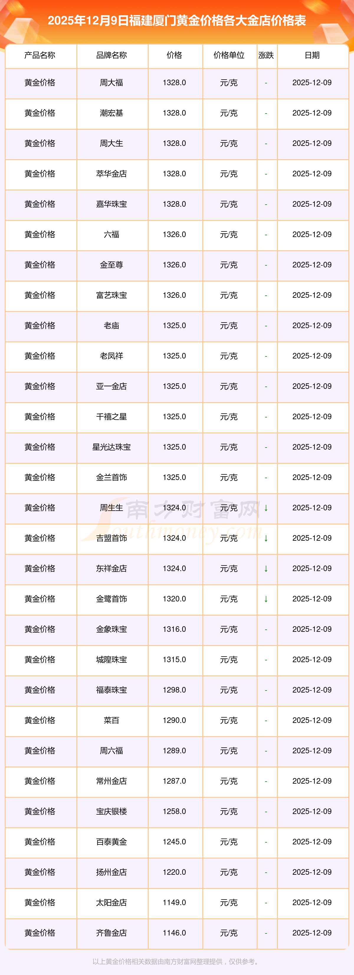 2025年12月9日,福建廈門周大福、周大福、周大福、周大福、周大福、周大福、周大福、周六福、周六福、周六福、周六福等各大金店品牌黃金價(jià)格今日價(jià)格行情最新來了:周大福1328.0元/克、周大福669.0元/克、周大福1328.0元/克、周大福46520.0、周大福19190.0、周大福41960.0、周大福1165.0元/克、周六福1289.0元/克、周六福613.0元/克、周六福613.0元/克、周六福1184.0元/克。