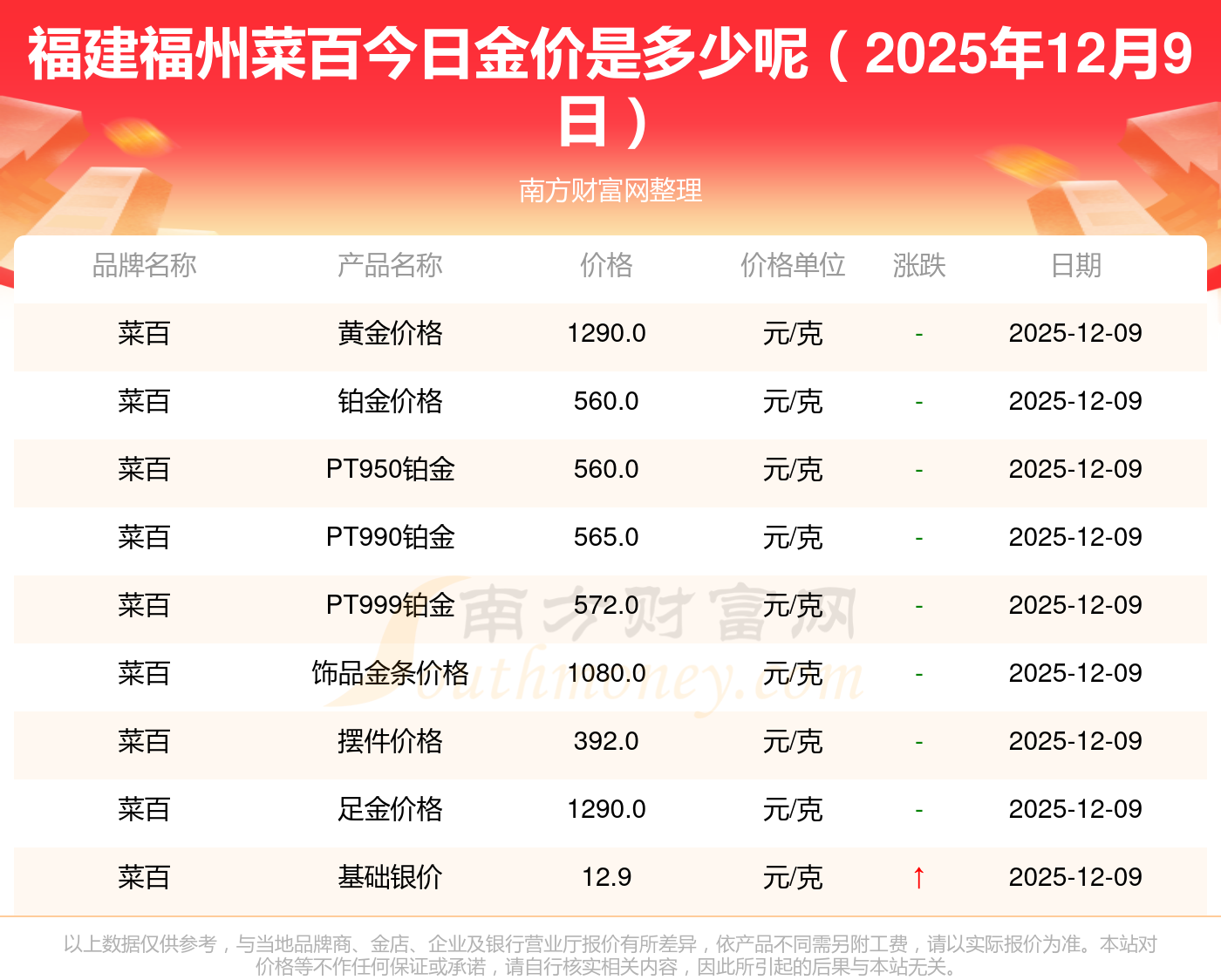 2025年12月9日福建福州菜百一克黃金對應(yīng)的價(jià)格是多少?黃金價(jià)格1328.0元/克,鉑金價(jià)格669.0元/克,飾品金價(jià)(內(nèi)地)1328.0元/克,黃金飾品(香港)46520.0,鉑金價(jià)格(香港)19190.0,金條價(jià)格(香港)41960.0,金條金價(jià)(內(nèi)地)1165.0元/克,黃金價(jià)格1289.0元/克,鉑金價(jià)格613.0元/克,PT999鉑金價(jià)格613.0元/克,金條價(jià)格1184.0元/克。