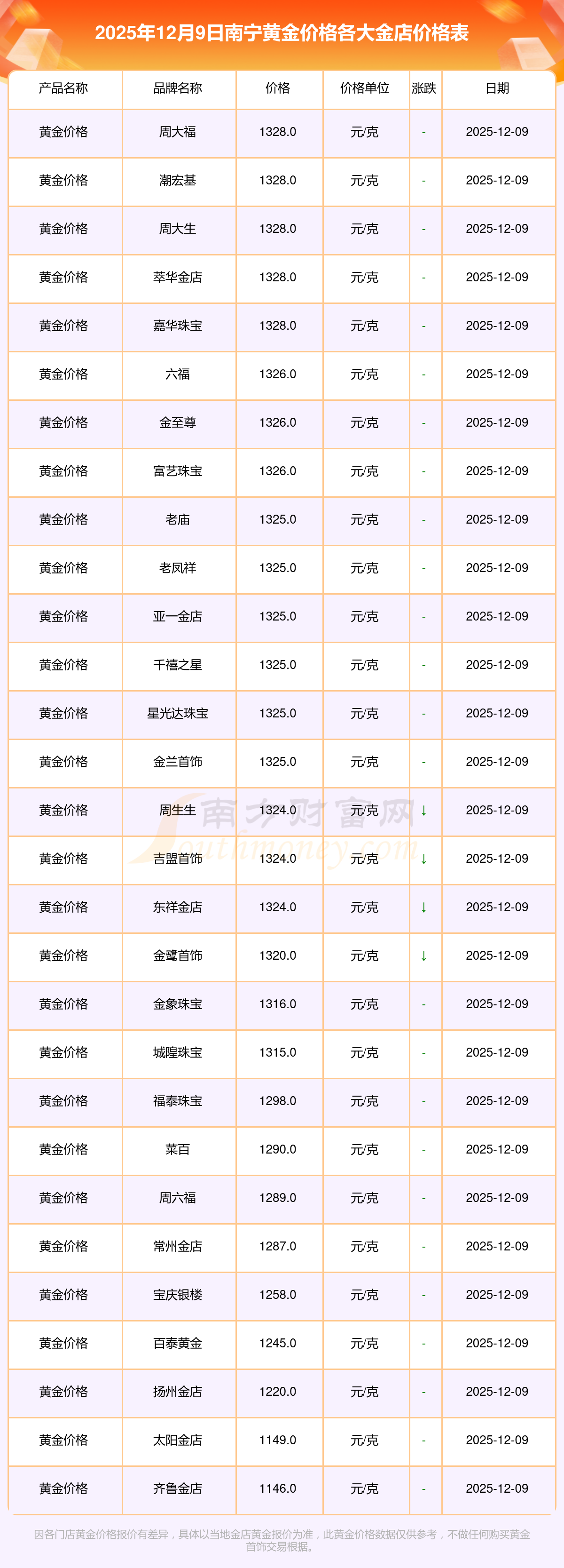 今天是2025年12月9日,南寧周大福、周大福、周大福、周大福、周大福、周大福、周大福、周六福、周六福、周六福、周六福等各大金店品牌黃金價格最新價格如下:周大福1328.0元/克、周大福669.0元/克、周大福1328.0元/克、周大福46520.0、周大福19190.0、周大福41960.0、周大福1165.0元/克、周六福1289.0元/克、周六福613.0元/克、周六福613.0元/克、周六福1184.0元/克。