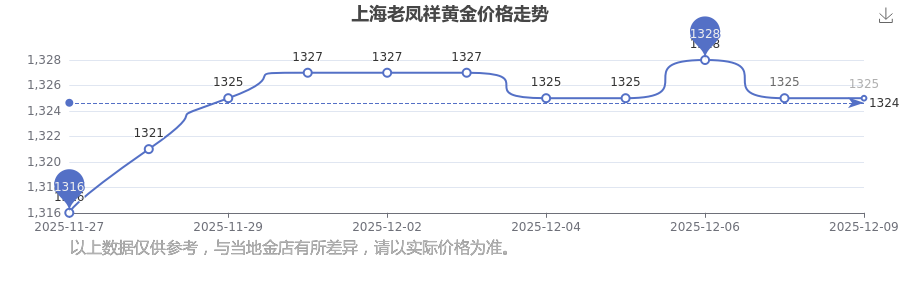2025年12月9日,上海老鳳祥所售黃金價(jià)格,其價(jià)格設(shè)定為 1325.0元/克。