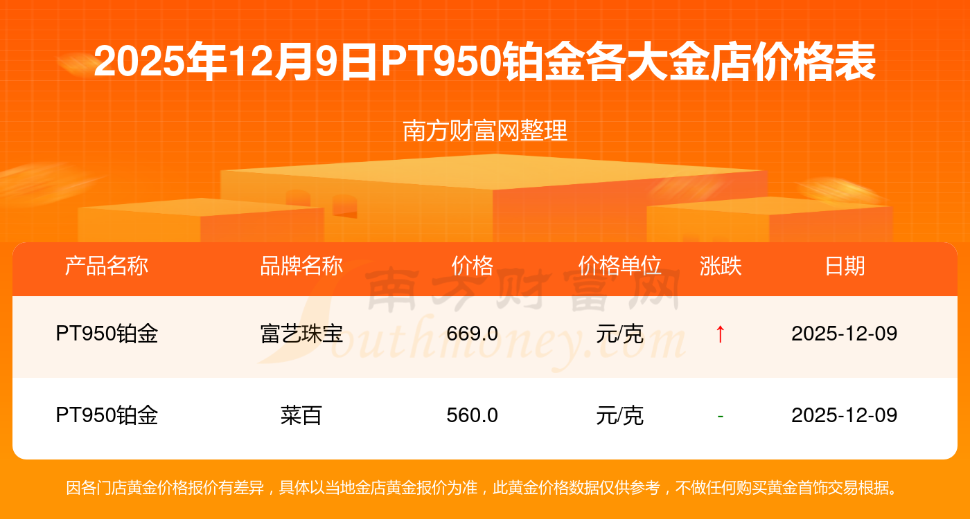 2025年12月9日各大金店P(guān)T950鉑金最新價(jià)格:周大福1328.0元/克,周大福669.0元/克,周大福1328.0元/克,周大福46520.0,周大福19190.0,周大福41960.0,周大福1165.0元/克,周六福1289.0元/克,周六福613.0元/克,周六福613.0元/克,周六福1184.0元/克。