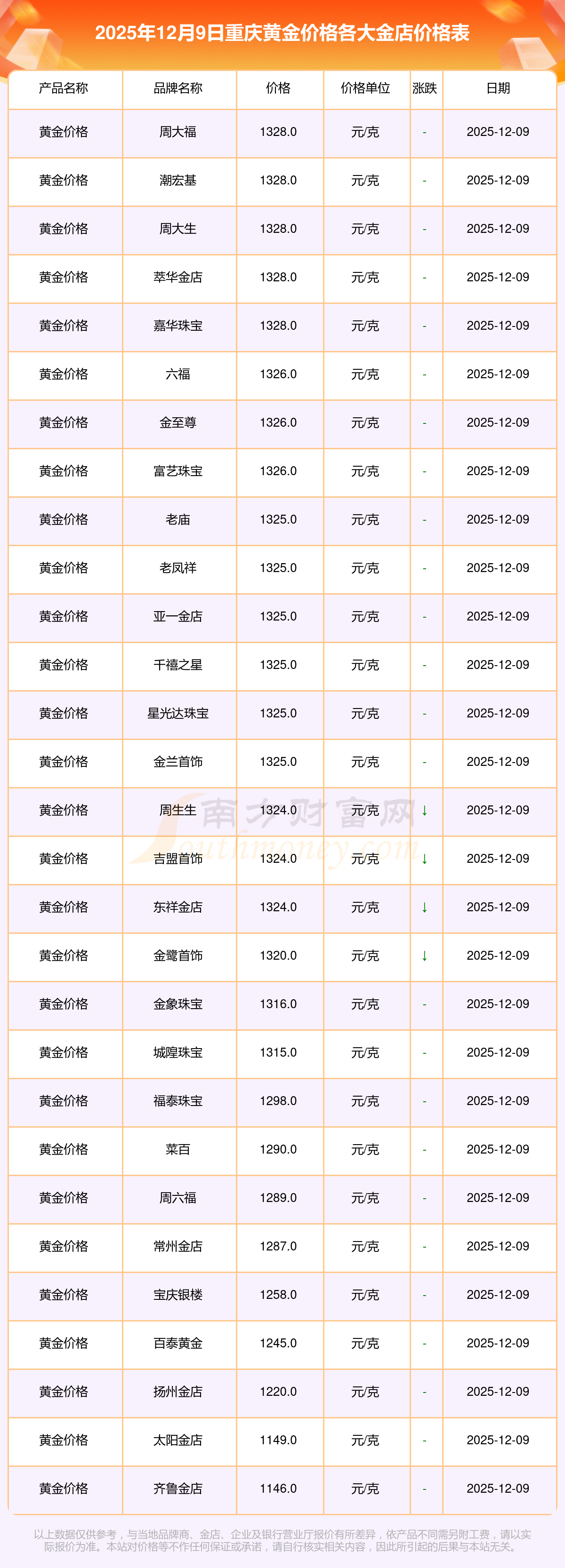 2025年12月9日重慶周大福、周大福、周大福、周大福、周大福、周大福、周大福、周六福、周六福、周六福、周六福等各大金店品牌黃金價(jià)格最新價(jià)格行情來了,如下:周大福黃金價(jià)格1328.0元/克,周大福鉑金價(jià)格669.0元/克,周大福飾品金價(jià)(內(nèi)地)1328.0元/克,周大福黃金飾品(香港)46520.0,周大福鉑金價(jià)格(香港)19190.0,周大福金條價(jià)格(香港)41960.0,周大福金條金價(jià)(內(nèi)地)1165.0元/克,周六福黃金價(jià)格1289.0元/克,周六福鉑金價(jià)格613.0元/克,周六福PT999鉑金價(jià)格613.0元/克,周六福金條價(jià)格1184.0元/克。