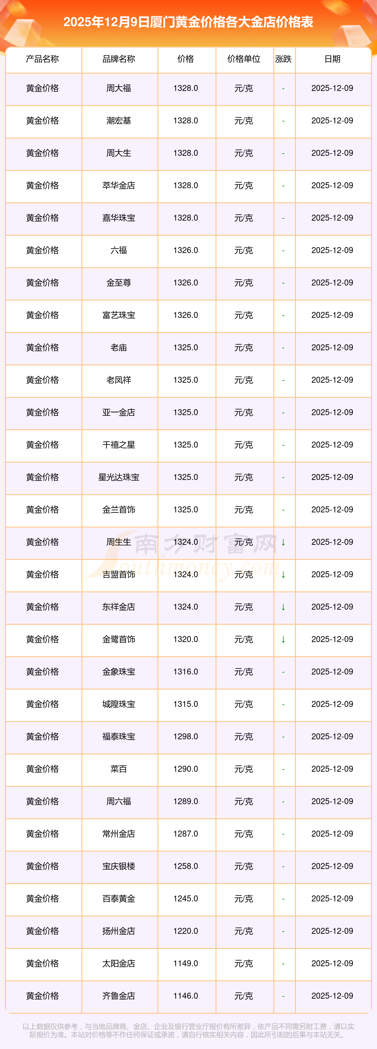 2025年12月9日廈門周大福、周大福、周大福、周大福、周大福、周大福、周大福、周六福、周六福、周六福、周六福等各大金店品牌黃金價(jià)格最新價(jià)格如下:周大福黃金價(jià)格1328.0元/克,周大福鉑金價(jià)格669.0元/克,周大福飾品金價(jià)(內(nèi)地)1328.0元/克,周大福黃金飾品(香港)46520.0,周大福鉑金價(jià)格(香港)19190.0,周大福金條價(jià)格(香港)41960.0,周大福金條金價(jià)(內(nèi)地)1165.0元/克,周六福黃金價(jià)格1289.0元/克,周六福鉑金價(jià)格613.0元/克,周六福PT999鉑金價(jià)格613.0元/克,周六福金條價(jià)格1184.0元/克。