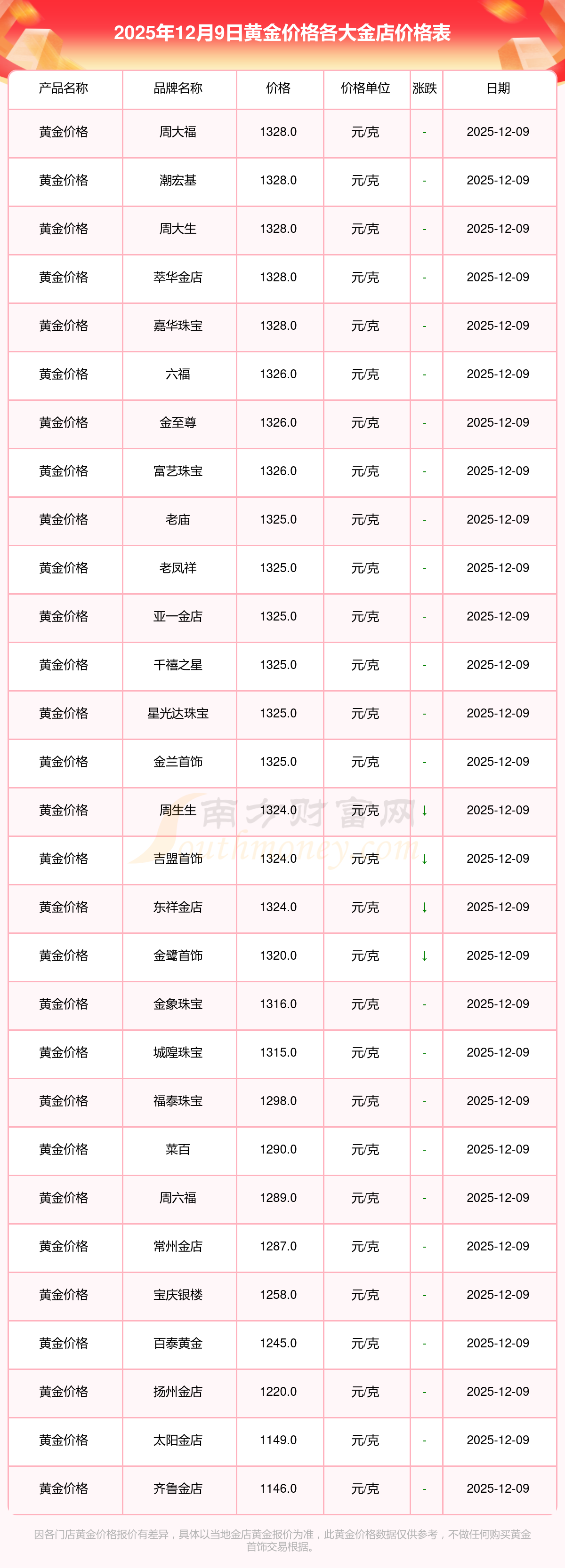 2025年12月9日各大金店黃金價(jià)格最新價(jià)格:周大福1328.0元/克,周大福669.0元/克,周大福1328.0元/克,周大福46520.0,周大福19190.0,周大福41960.0,周大福1165.0元/克,周六福1289.0元/克,周六福613.0元/克,周六福613.0元/克,周六福1184.0元/克。