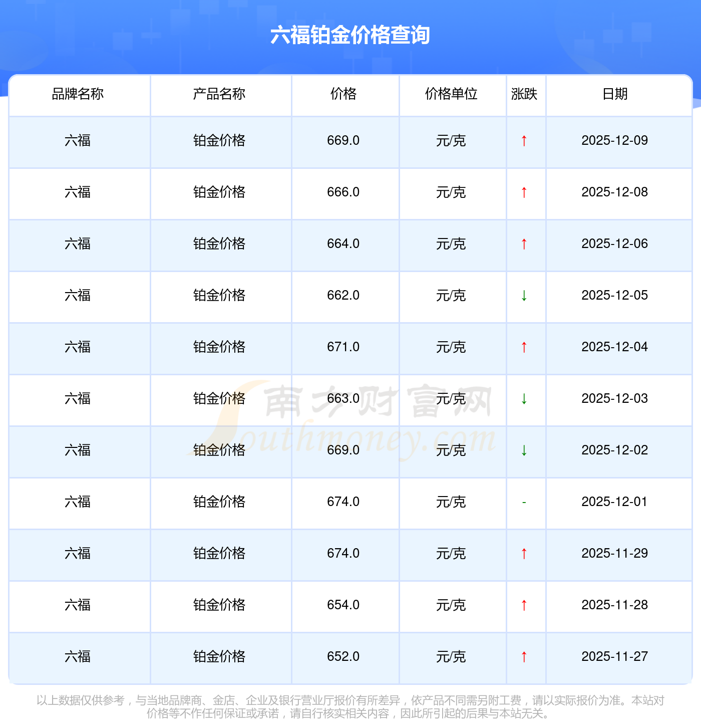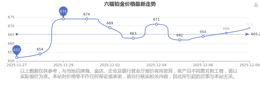 今日六福所公布的 鉑金價(jià)格最新價(jià)格為669.0元/克。