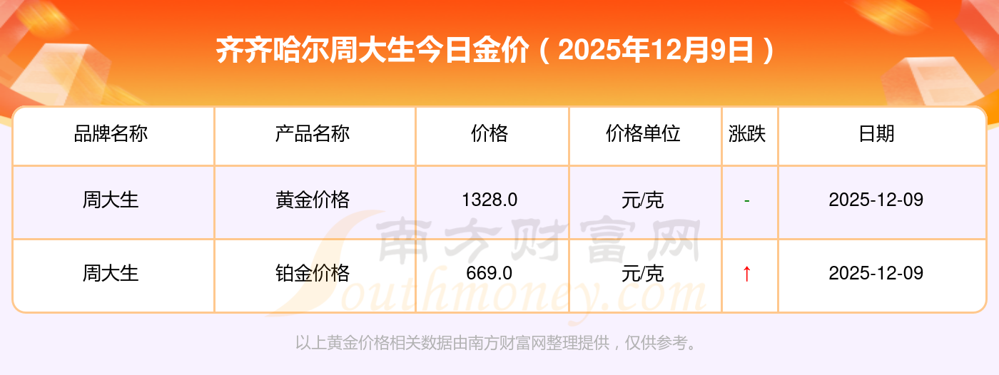 今日黃金價(jià)格查詢_現(xiàn)在金價(jià)黃金一克多少錢,黃金價(jià)格是多少錢一克?2025年12月9日齊齊哈爾周大生金價(jià)查詢:黃金價(jià)格1328.0元/克,鉑金價(jià)格669.0元/克,飾品金價(jià)(內(nèi)地)1328.0元/克,黃金飾品(香港)46520.0,鉑金價(jià)格(香港)19190.0,金條價(jià)格(香港)41960.0,金條金價(jià)(內(nèi)地)1165.0元/克,黃金價(jià)格1289.0元/克,鉑金價(jià)格613.0元/克,PT999鉑金價(jià)格613.0元/克,金條價(jià)格1184.0元/克。