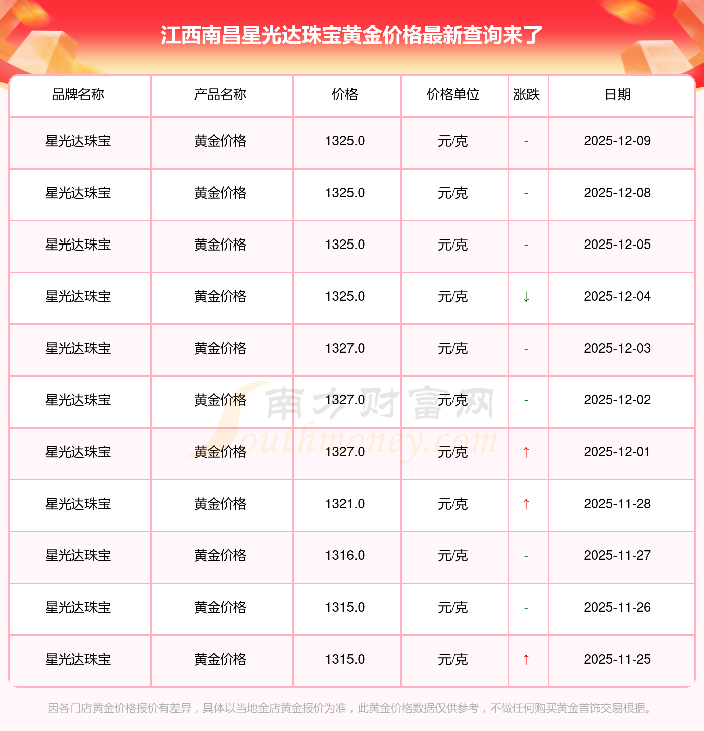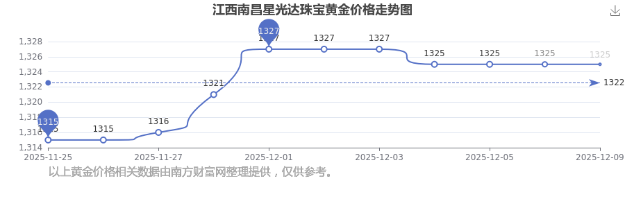 江西南昌星光達(dá)珠寶的黃金價(jià)格在今日(2025年12月9日),每克售價(jià)為1325.0元/克。