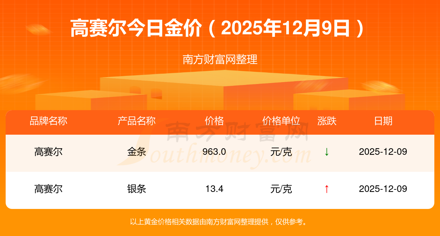 2025年12月9日高賽爾最新價(jià)格:黃金價(jià)格1328.0元/克,鉑金價(jià)格669.0元/克,飾品金價(jià)(內(nèi)地)1328.0元/克,黃金飾品(香港)46520.0,鉑金價(jià)格(香港)19190.0,金條價(jià)格(香港)41960.0,金條金價(jià)(內(nèi)地)1165.0元/克,黃金價(jià)格1289.0元/克,鉑金價(jià)格613.0元/克,PT999鉑金價(jià)格613.0元/克,金條價(jià)格1184.0元/克。