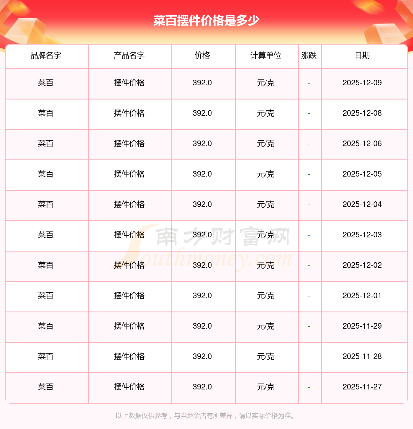 今日菜百 擺件價格,最新確定為392.0元/克。