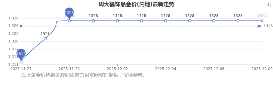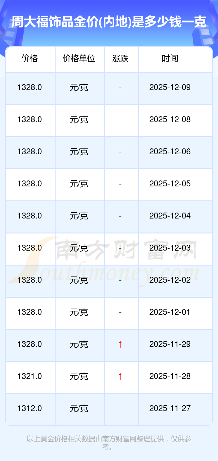 今日(2025年12月9日)周大福飾品金價(內(nèi)地):1328.0元/克。