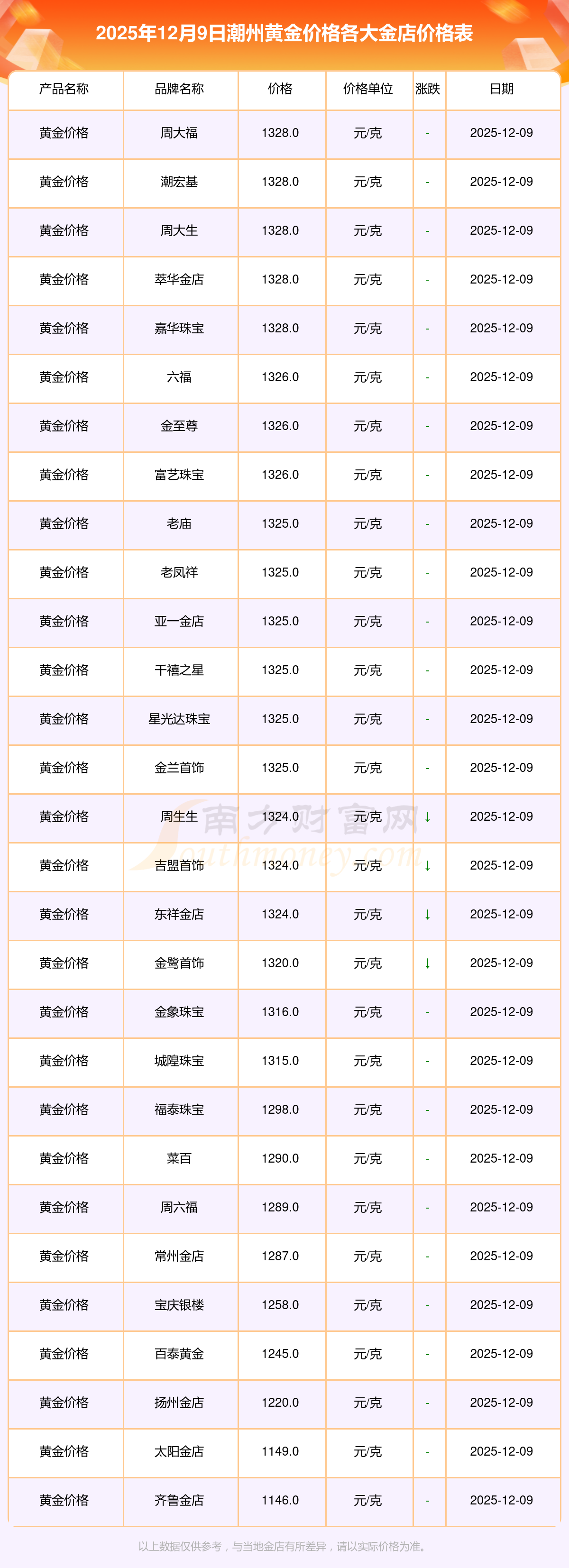今天是2025年12月9日,潮州周大福、周大福、周大福、周大福、周大福、周大福、周大福、周六福、周六福、周六福、周六福等各大金店品牌黃金價(jià)格最新價(jià)格行情是這樣的:周大福1328.0元/克、周大福669.0元/克、周大福1328.0元/克、周大福46520.0、周大福19190.0、周大福41960.0、周大福1165.0元/克、周六福1289.0元/克、周六福613.0元/克、周六福613.0元/克、周六福1184.0元/克。