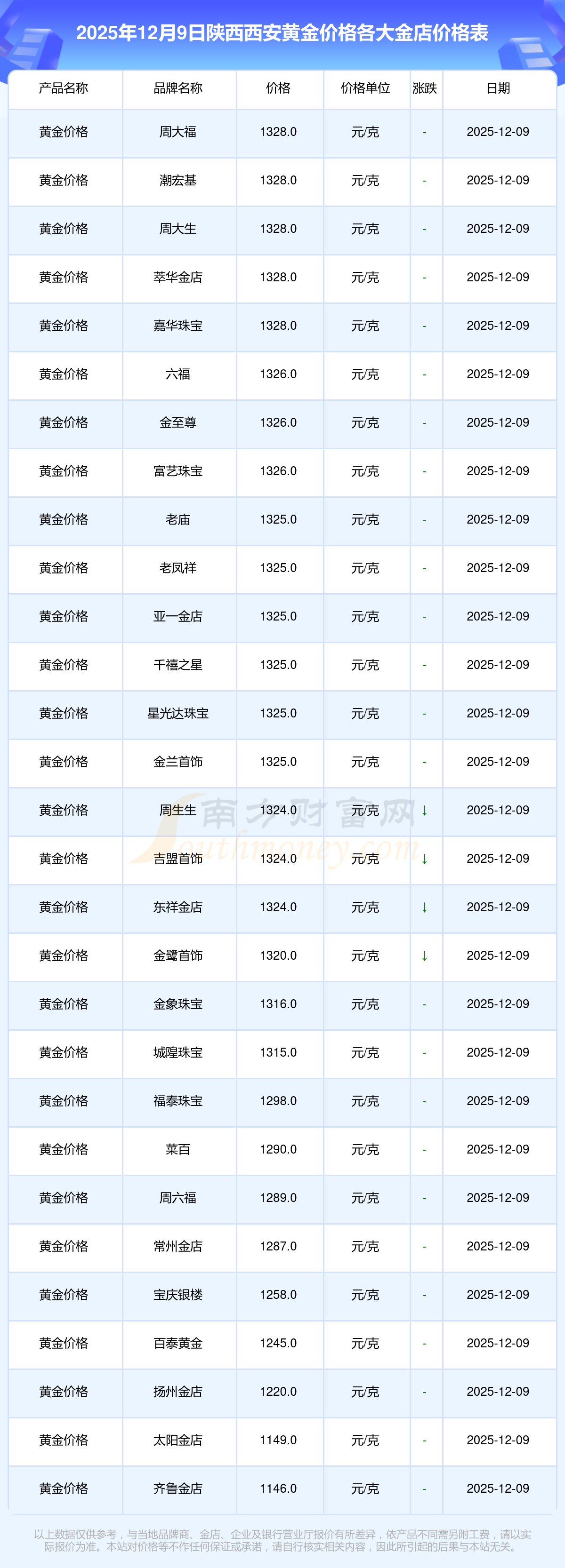 2025年12月9日陜西西安周大福、周大福、周大福、周大福、周大福、周大福、周大福、周六福、周六福、周六福、周六福等各大金店品牌黃金價(jià)格最新價(jià)格行情來了,如下:周大福黃金價(jià)格1328.0元/克,周大福鉑金價(jià)格669.0元/克,周大福飾品金價(jià)(內(nèi)地)1328.0元/克,周大福黃金飾品(香港)46520.0,周大福鉑金價(jià)格(香港)19190.0,周大福金條價(jià)格(香港)41960.0,周大福金條金價(jià)(內(nèi)地)1165.0元/克,周六福黃金價(jià)格1289.0元/克,周六福鉑金價(jià)格613.0元/克,周六福PT999鉑金價(jià)格613.0元/克,周六福金條價(jià)格1184.0元/克。