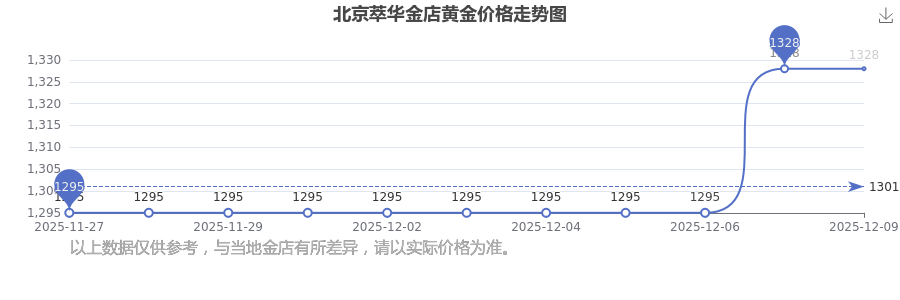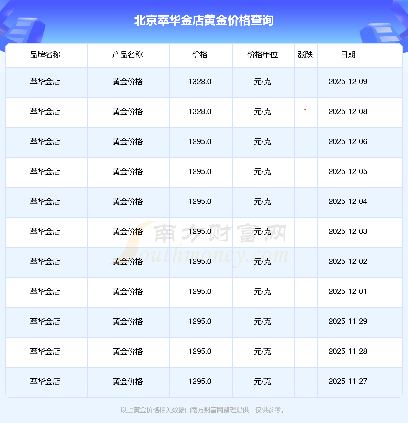 2025年12月9日北京萃華金店黃金價(jià)格:1328.0元/克。