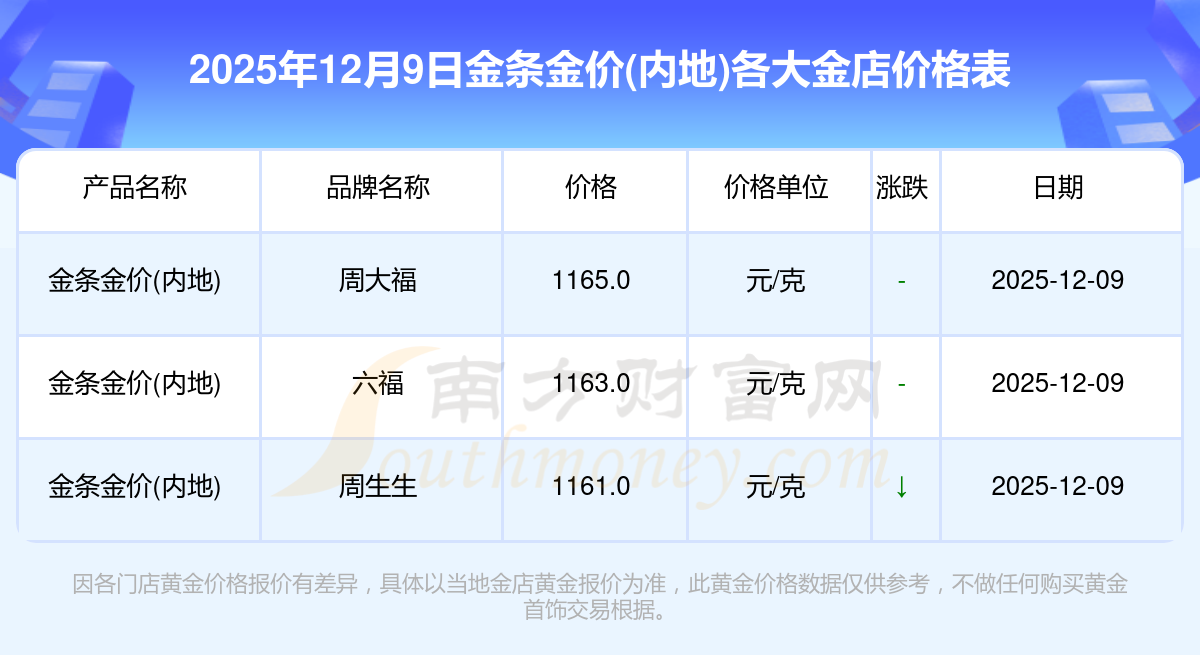 今天是2025年12月9日,周大福、周大福、周大福、周大福、周大福、周大福、周大福、周六福、周六福、周六福、周六福等各大金店品牌金條金價(內(nèi)地)最新價格如下:周大福1328.0元/克、周大福669.0元/克、周大福1328.0元/克、周大福46520.0、周大福19190.0、周大福41960.0、周大福1165.0元/克、周六福1289.0元/克、周六福613.0元/克、周六福613.0元/克、周六福1184.0元/克。