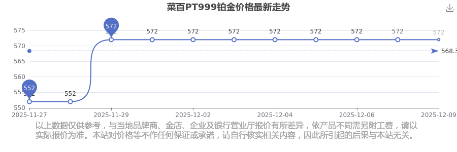 今日(2025年12月9日),菜百PT999鉑金最新價格是572.0元/克。
