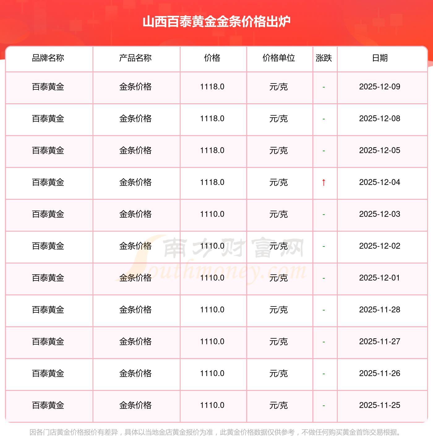 今日山西百泰黃金金條價(jià)格最新查詢,2025年12月9日百泰黃金金條價(jià)格是多少錢一克?隨小編來了解一下詳情。