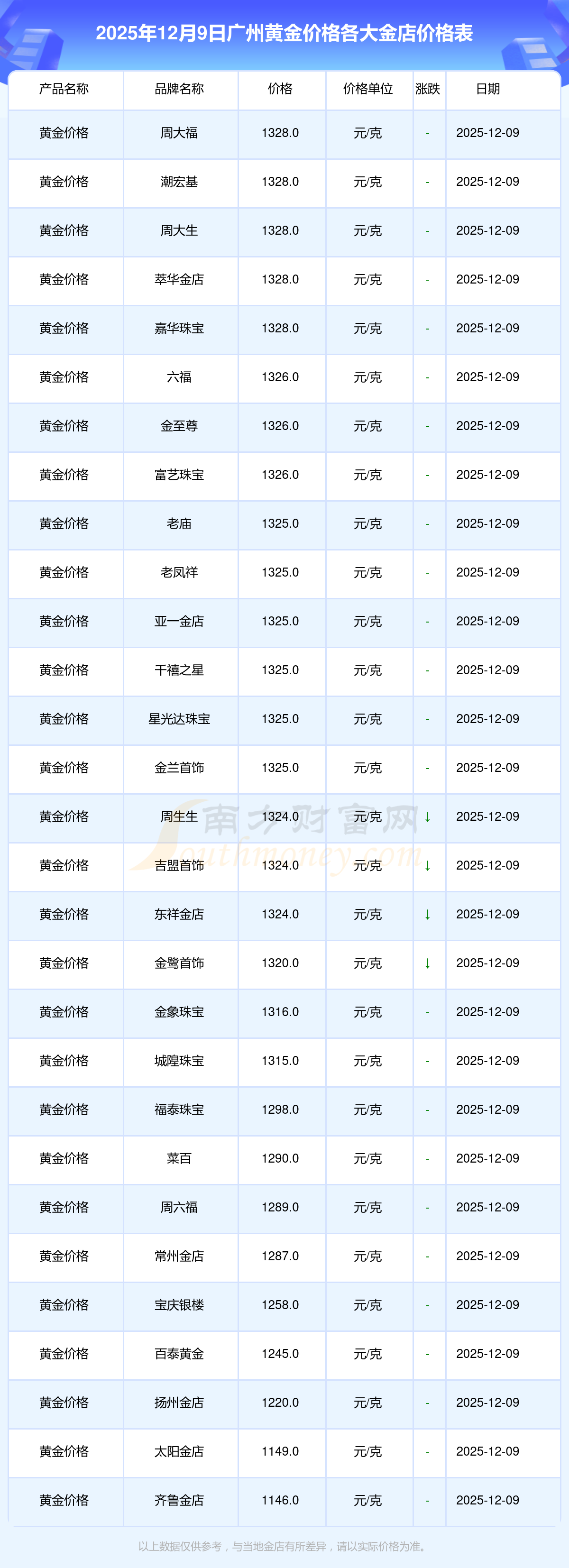 2025年12月9日,廣州周大福、周大福、周大福、周大福、周大福、周大福、周大福、周六福、周六福、周六福、周六福等各大金店品牌黃金價格今日價格行情最新來了:周大福1328.0元/克、周大福669.0元/克、周大福1328.0元/克、周大福46520.0、周大福19190.0、周大福41960.0、周大福1165.0元/克、周六福1289.0元/克、周六福613.0元/克、周六福613.0元/克、周六福1184.0元/克。