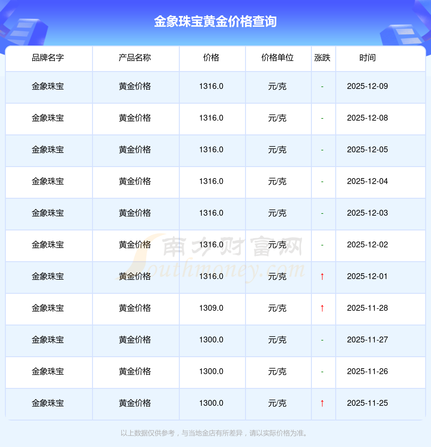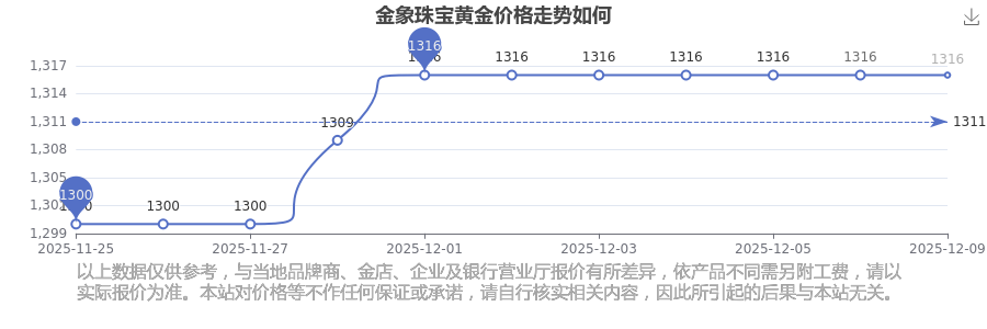 當(dāng)下,金象珠寶 黃金價(jià)格今日的最新價(jià)格是1316.0元/克。