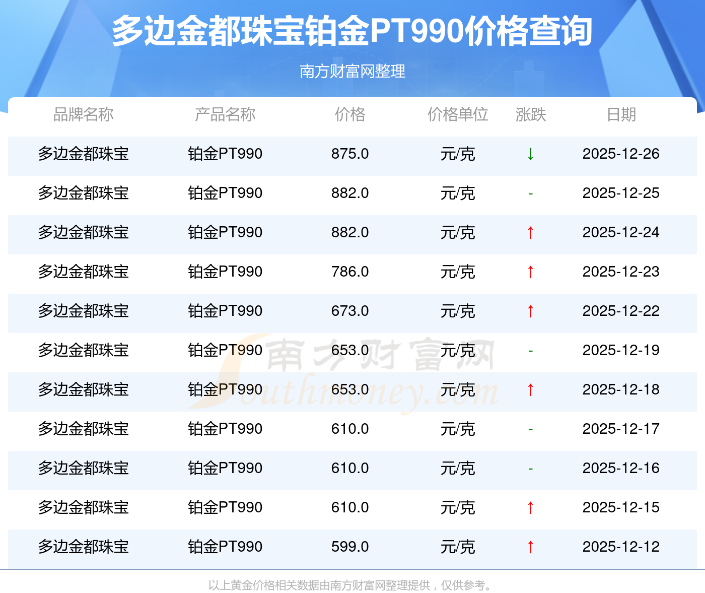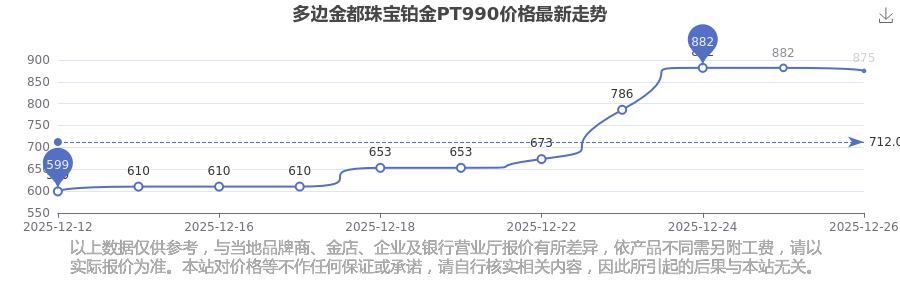多邊金都珠寶 鉑金PT990價格在今日更新至875.0元/克。