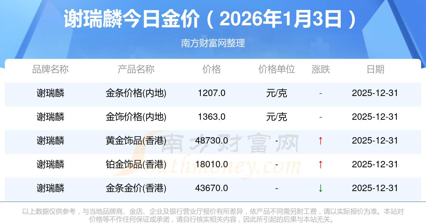 2026年1月3日謝瑞麟今日價(jià)格:黃金價(jià)格1363.0元/克,黃金價(jià)格1366.0元/克,黃金價(jià)格1365.0元/克,黃金價(jià)格1355.0元/克,鉑金價(jià)格849.0元/克,飾品金價(jià)(內(nèi)地)1363.0元/克,黃金飾品(香港)48780.0,鉑金價(jià)格(香港)25090.0,金條價(jià)格(香港)43680.0,金條金價(jià)(內(nèi)地)1195.0元/克,鉑金價(jià)格820.0元/克。