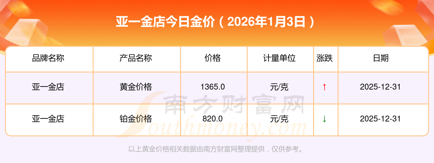 2026年1月3日各大金店黃金價(jià)格最新價(jià)格:周大福1363.0元/克,老鳳祥1366.0元/克,老廟1365.0元/克,周生生1355.0元/克,周大福849.0元/克,周大福1363.0元/克,周大福48780.0,周大福25090.0,周大福43680.0,周大福1195.0元/克,老鳳祥820.0元/克。