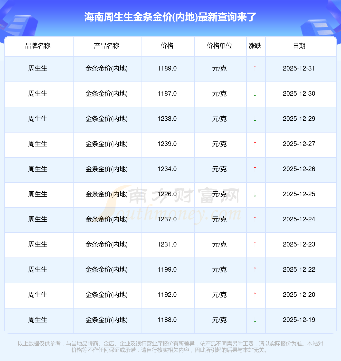 今日(2026年1月3日),1189.0元/克是海南周生生金條金價(jià)(內(nèi)地)的價(jià)格標(biāo)準(zhǔn)。