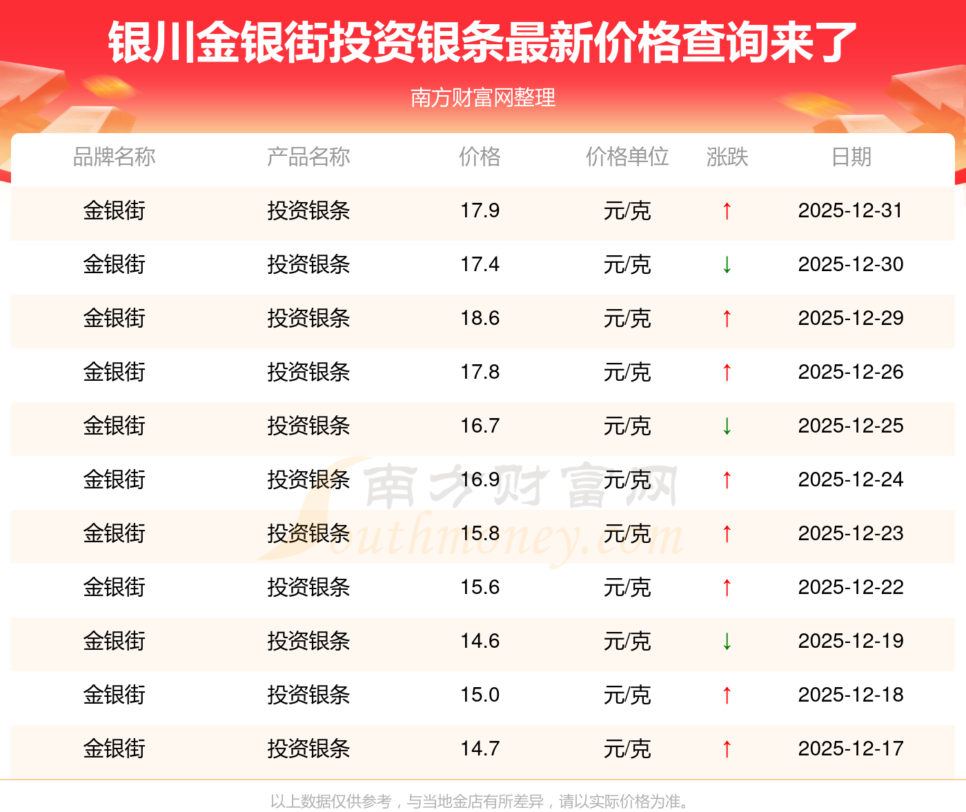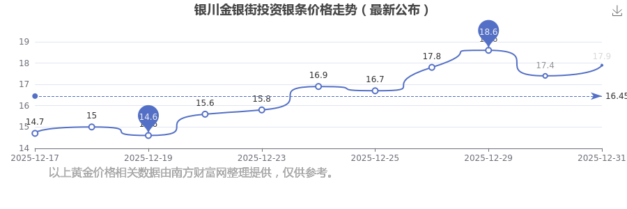 今日(2026年1月3日)銀川金銀街投資銀條價格:17.9元/克。