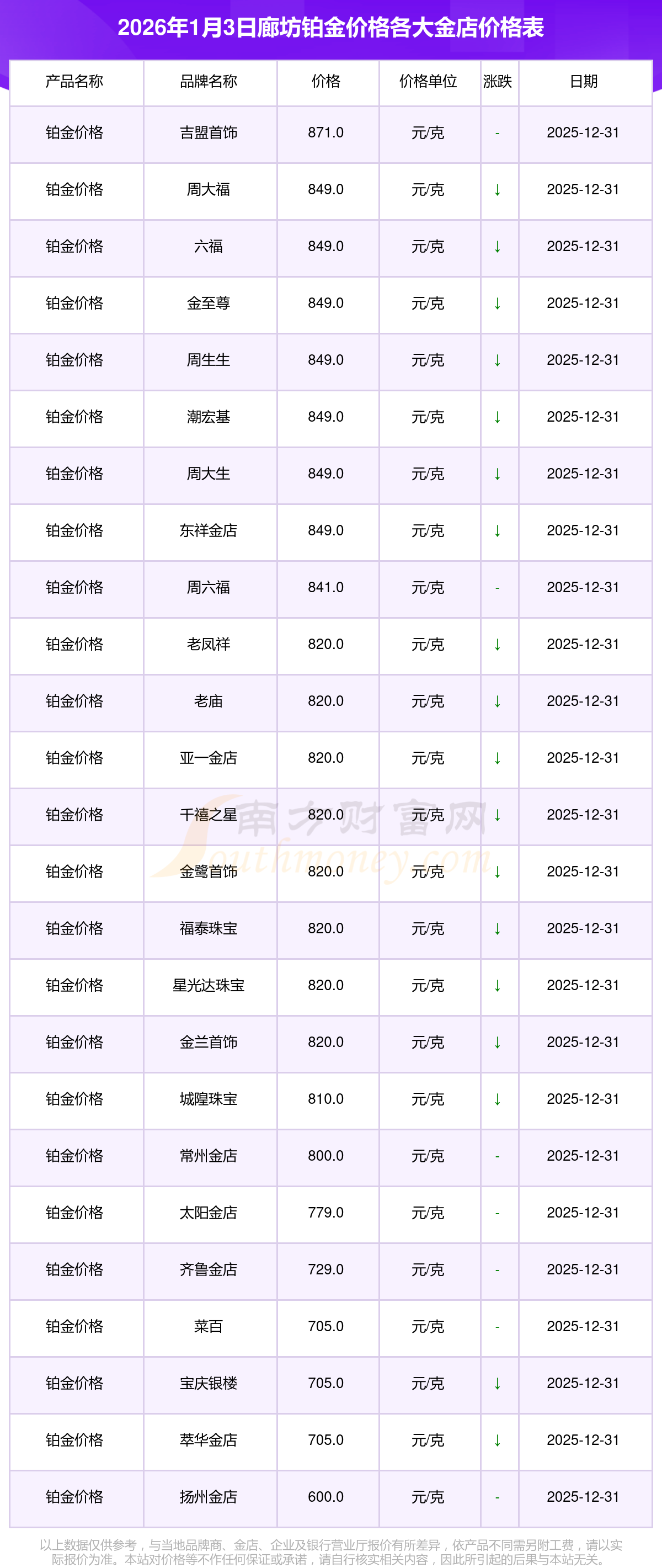2026年1月3日廊坊各大金店鉑金價格最新價格:周大福1363.0元/克,老鳳祥1366.0元/克,老廟1365.0元/克,周生生1355.0元/克,周大福849.0元/克,周大福1363.0元/克,周大福48780.0,周大福25090.0,周大福43680.0,周大福1195.0元/克,老鳳祥820.0元/克。