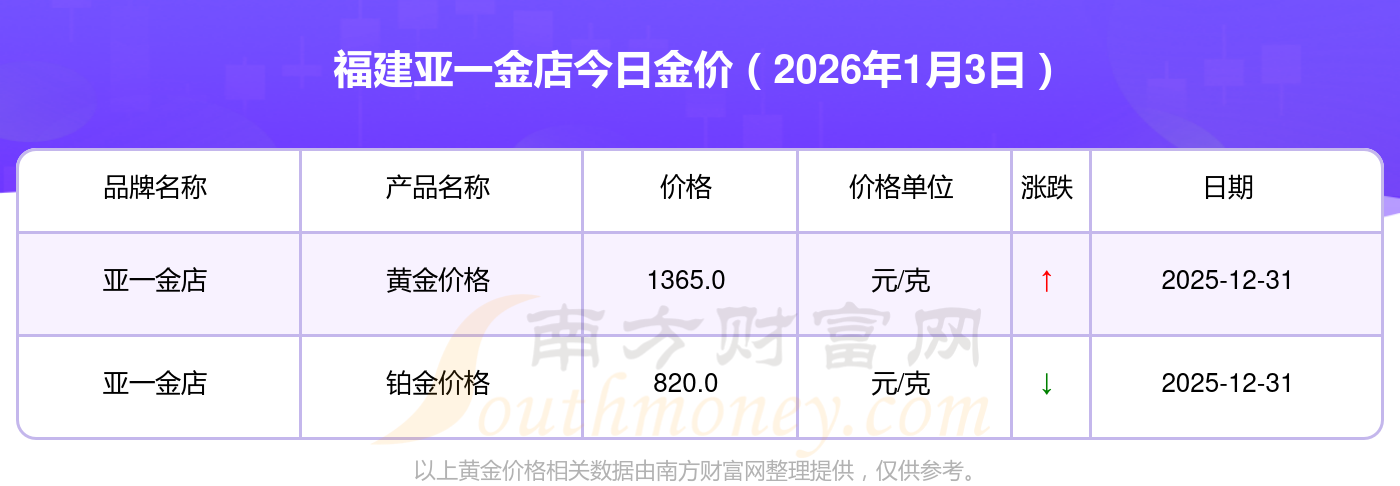 今日黃金價(jià)格查詢_現(xiàn)在金價(jià)黃金一克多少錢,黃金價(jià)格是多少錢一克?2026年1月3日福建亞一金店一克黃金對應(yīng)的價(jià)格是多少?黃金價(jià)格1363.0元/克,黃金價(jià)格1366.0元/克,黃金價(jià)格1365.0元/克,黃金價(jià)格1355.0元/克,鉑金價(jià)格849.0元/克,飾品金價(jià)(內(nèi)地)1363.0元/克,黃金飾品(香港)48780.0,鉑金價(jià)格(香港)25090.0,金條價(jià)格(香港)43680.0,金條金價(jià)(內(nèi)地)1195.0元/克,鉑金價(jià)格820.0元/克。