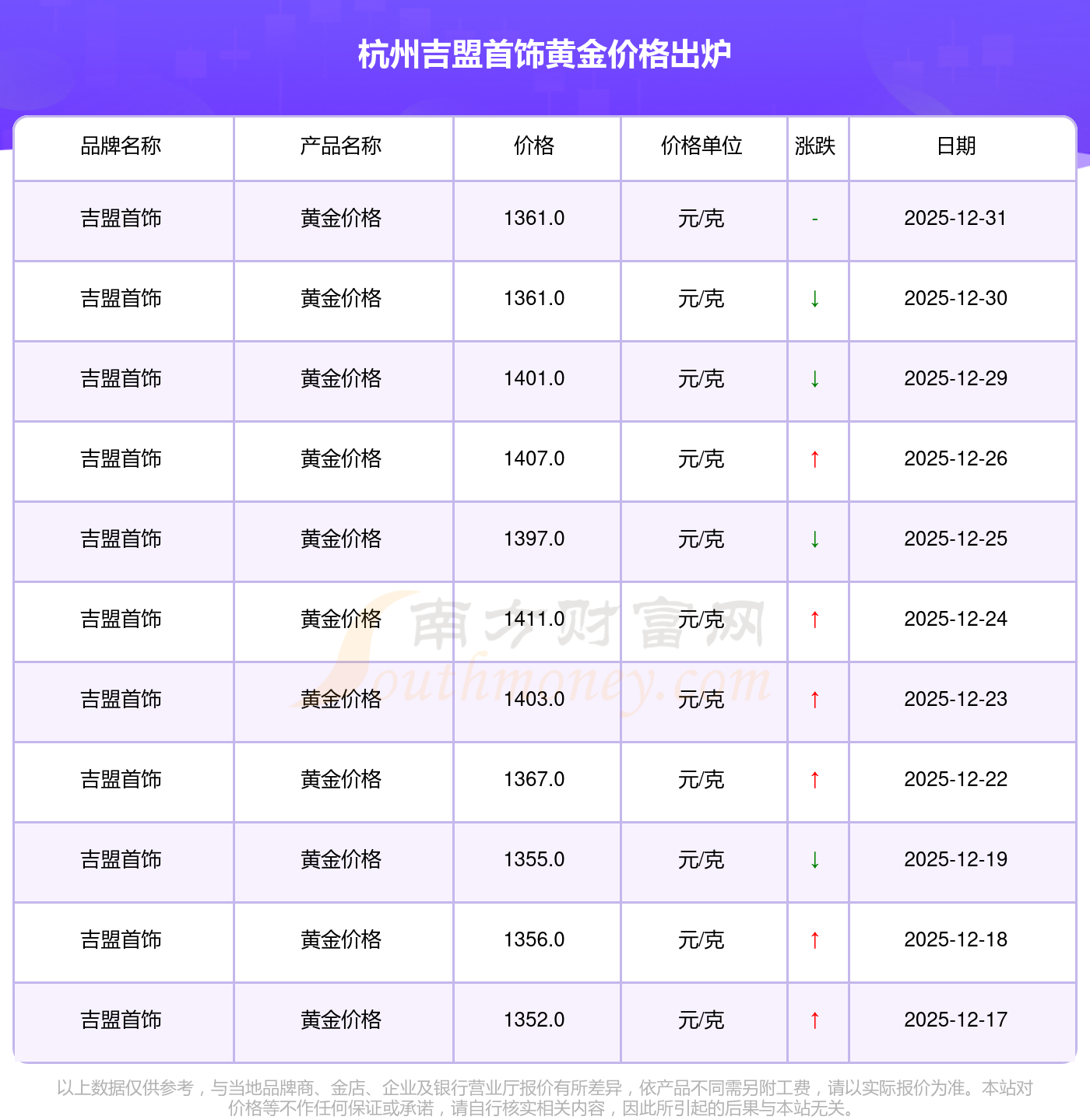 今天的黃金,以克為單位,其價格是多少,今日不同品牌黃金價格匯總表,今日杭州吉盟首飾黃金價格圖表