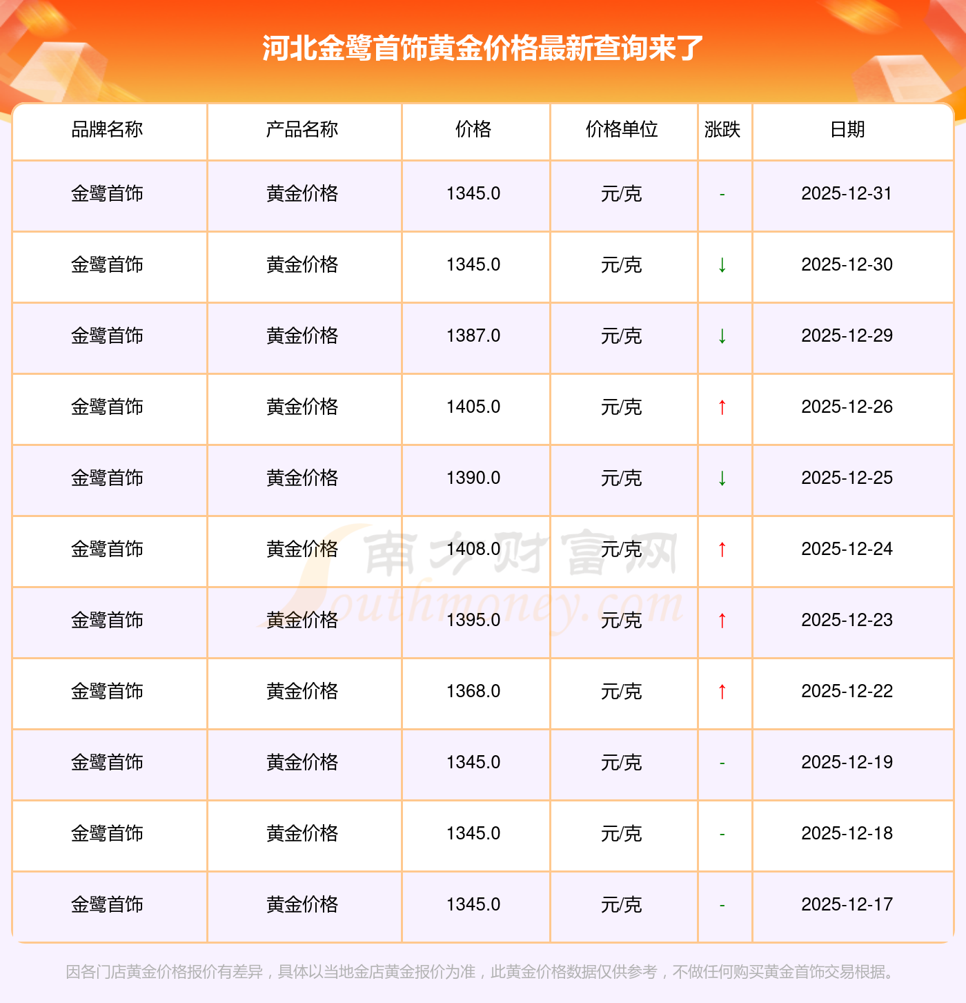 2026年1月3日河北金鷺首飾黃金價格:1345.0元/克。