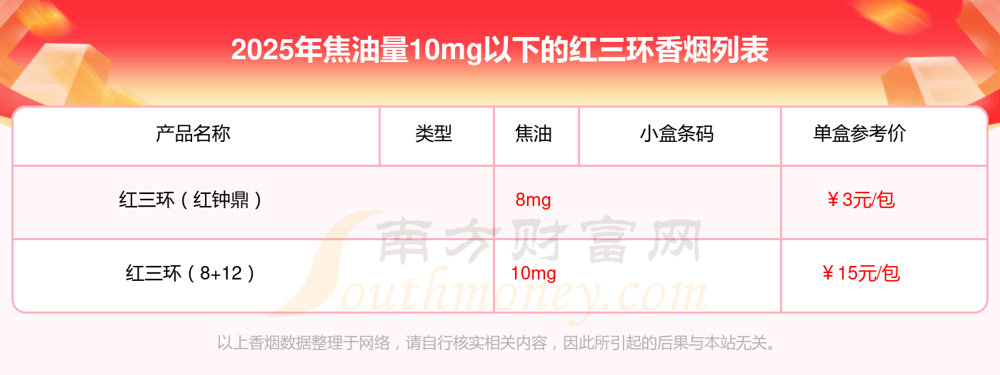 紅三環(huán)香煙焦油量10mg以下的煙有紅三環(huán)(紅鐘鼎)、紅三環(huán)(8+12)等,具體價格如下: