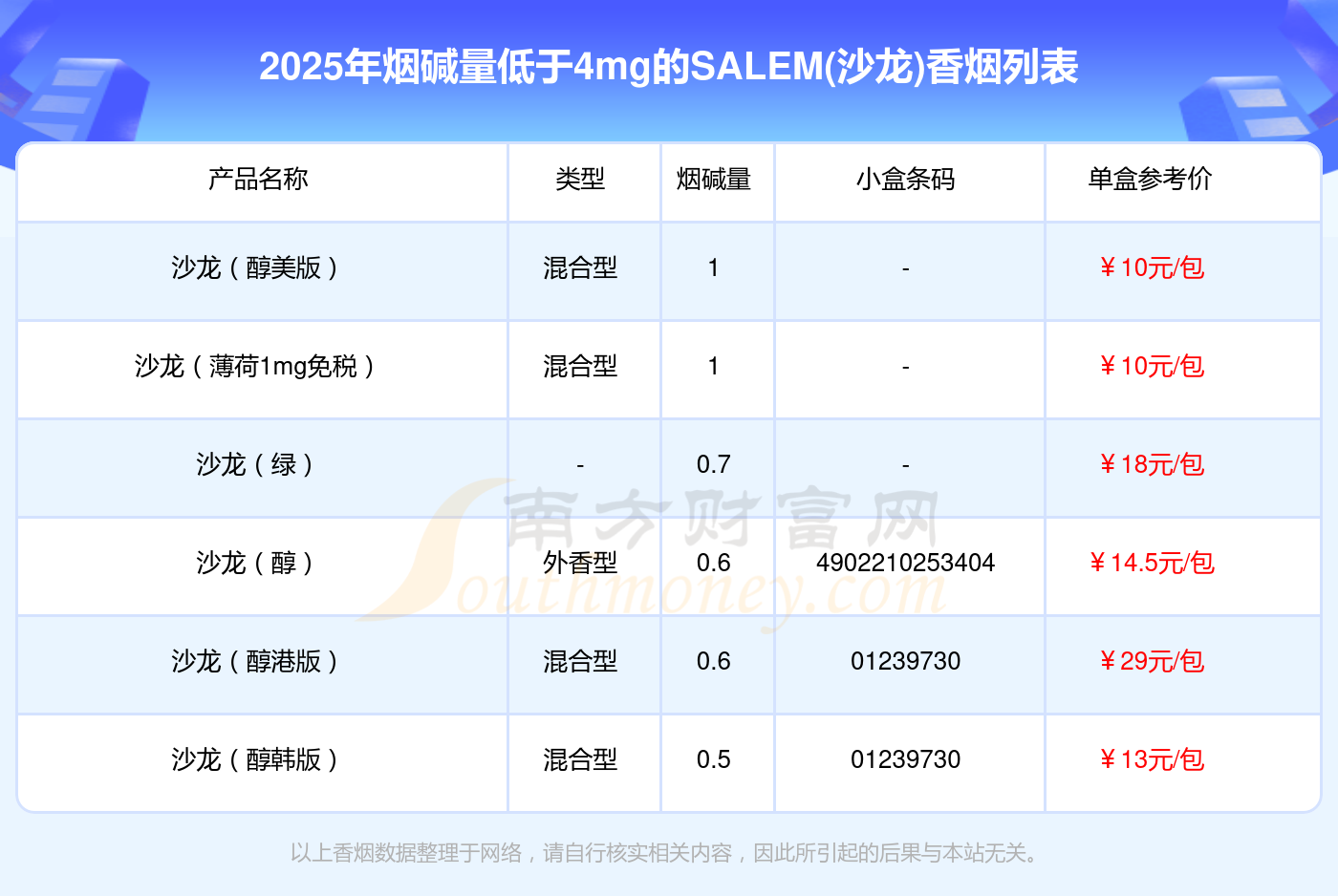 SALEM(沙龍)香煙煙堿量低于4mg的煙有哪些?擇煙網(wǎng)為大家整理提供,分別有:沙龍(醇美版)、沙龍(薄荷1mg免稅)、沙龍(綠)、沙龍(醇)、沙龍(醇港版)、沙龍(醇韓版)等,具體價格如下: