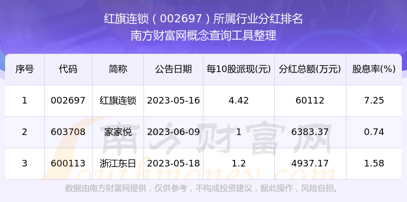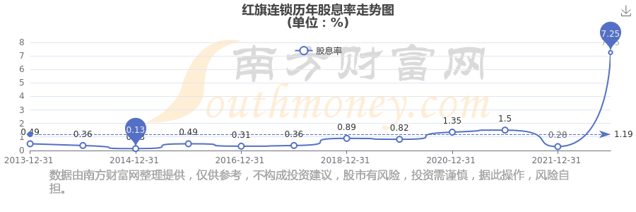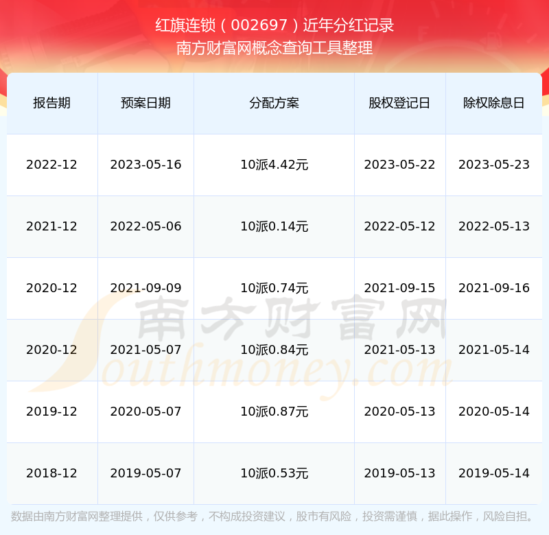 紅旗連鎖最新一次公布的分紅方案為10派4.42元。本次權益分派股權登記日為2023年5月22日,除權除息日為2023年5月23日,派息日為2023年5月23日。