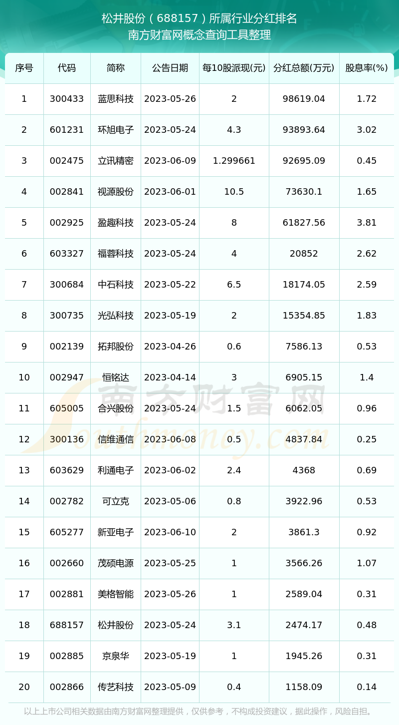 按照南方財(cái)富網(wǎng)趨勢(shì)選股系統(tǒng)統(tǒng)計(jì),松井股份所屬行業(yè)為消費(fèi)電子行業(yè),消費(fèi)電子行業(yè)分紅排名情況如下表: