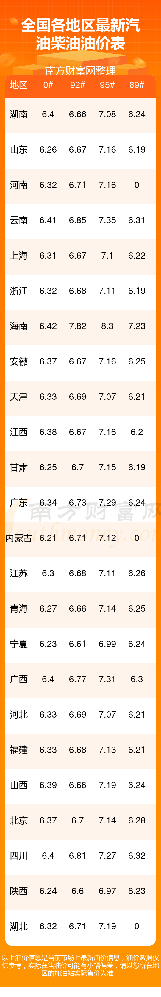 油價數(shù)據(jù)僅供參考,請以您所在地區(qū)的各加油站報價為準(zhǔn)。