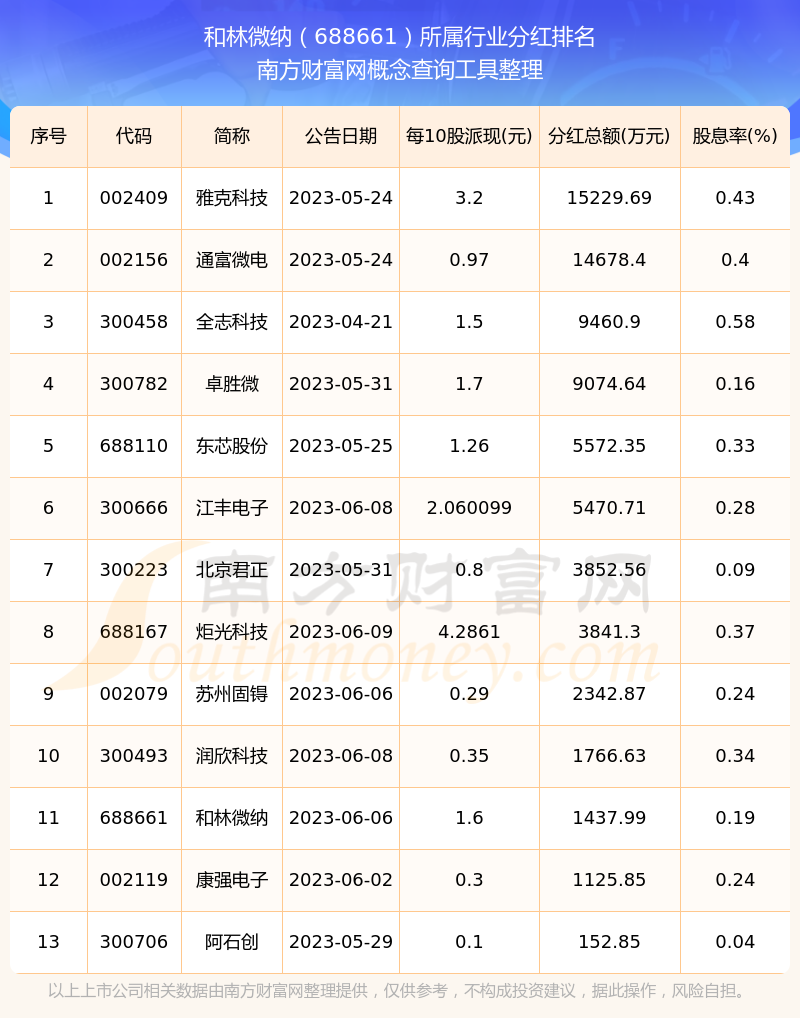 按照南方財(cái)富網(wǎng)趨勢(shì)選股系統(tǒng)統(tǒng)計(jì),和林微納所屬行業(yè)為半導(dǎo)體行業(yè),半導(dǎo)體行業(yè)分紅排名情況如下表: