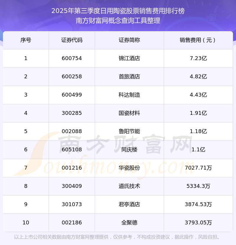 2025年第三季度日用陶瓷股票銷售費(fèi)用排行榜如下:錦江酒店(600754)的銷售費(fèi)用總額高達(dá)7.23億,首旅酒店(600258)和科達(dá)制造(600499)分別位居第二和第三,國(guó)瓷材料(300285)、魯陽(yáng)節(jié)能(002088)、同慶樓(605108)、華瓷股份(001216)、道氏技術(shù)(300409)、君亭酒店(301073)、全聚德(002186)分別進(jìn)入前十,其銷售費(fèi)用總額分別排名第4-10名。