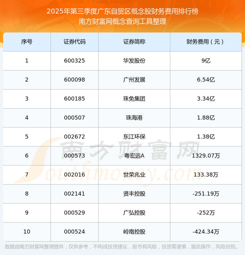 2025年第三季度,廣東自貿(mào)區(qū)概念股財務費用排行榜中,華發(fā)股份(600325)財務費用總額高達9億,廣州發(fā)展(600098)和珠免集團(600185)排名第二和第三,珠海港(000507)、東江環(huán)保(002672)、粵宏遠A(000573)、世榮兆業(yè)(002016)、賢豐控股(002141)、廣弘控股(000529)、嶺南控股(000524)進入前十,財務費用總額分別排名第4-10名。