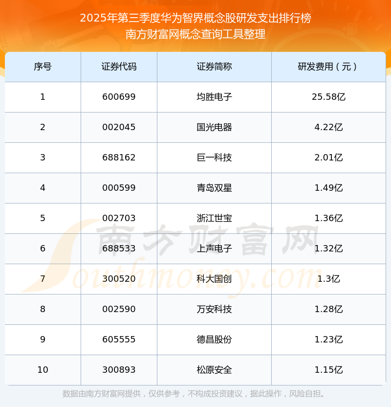 2025年第三季度,華為智界概念股研發(fā)支出排名如下:均勝電子(600699)研發(fā)支出總額高達(dá)25.58億,國(guó)光電器(002045)和巨一科技(688162)分別位居第二和第三,青島雙星(000599)、浙江世寶(002703)、上聲電子(688533)、科大國(guó)創(chuàng)(300520)、萬(wàn)安科技(002590)、德昌股份(605555)、松原安全(300893)分別進(jìn)入前十,其研發(fā)支出總額分別排名第4-10名。