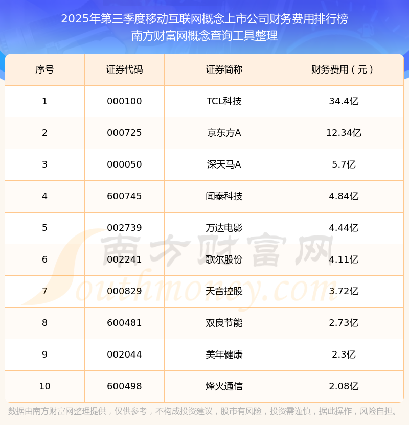 2025年第三季度,移動互聯(lián)網(wǎng)概念上市公司財務(wù)費用排名如下:TCL科技(000100)的財務(wù)費用總額高達(dá)34.4億,京東方A(000725)和深天馬A(000050)分別位居第二和第三,聞泰科技(600745)、萬達(dá)電影(002739)、歌爾股份(002241)、天音控股(000829)、雙良節(jié)能(600481)、美年健康(002044)、烽火通信(600498)分別進(jìn)入前十,其財務(wù)費用總額分別排名第4-10名。