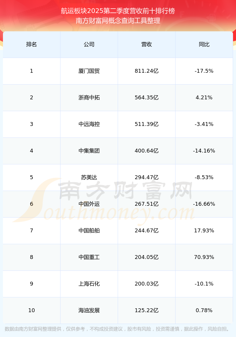 按照南方財富網概念查詢工具統(tǒng)計,該股所屬板塊為航運板塊,該板塊共有92只股票,中遠?2025第二季度營收在該板塊中排名為第3名,該板塊2025第二季度營收排名前十的股票如下表: