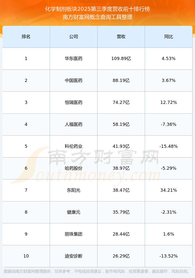 按照南方財富網(wǎng)概念查詢工具統(tǒng)計,該股所屬板塊為化學制劑板塊,該板塊共有106只股票,哈藥股份2025第三季度營收在該板塊中排名為第6名,該板塊2025第三季度營收排名前十的股票如下表: