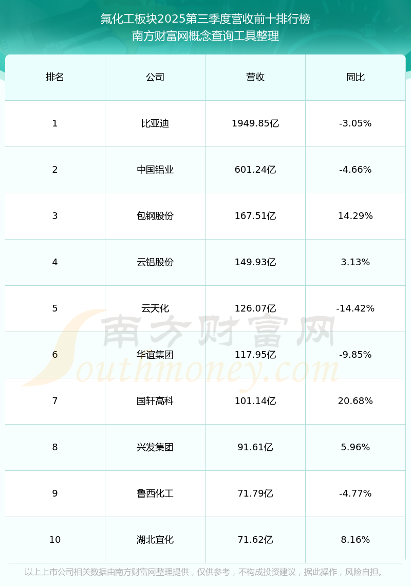 按照南方財富網(wǎng)概念查詢工具統(tǒng)計,該股所屬板塊為氟化工板塊,該板塊共有48只股票,巍華新材2025第三季度營收在該板塊中排名為第41名,該板塊2025第三季度營收排名前十的股票如下表: