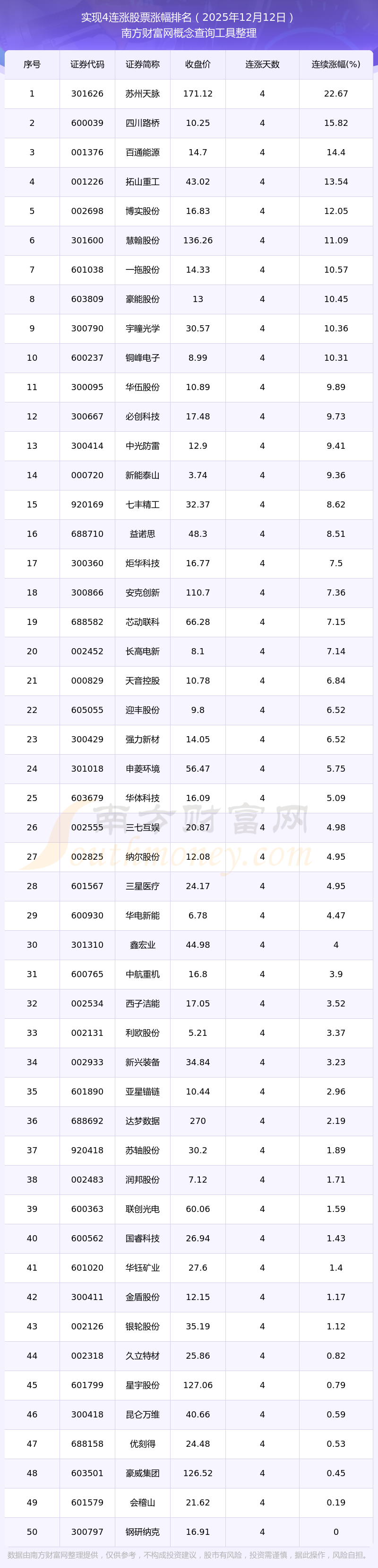 2025年12月12日實(shí)現(xiàn)4連漲股票漲幅排名