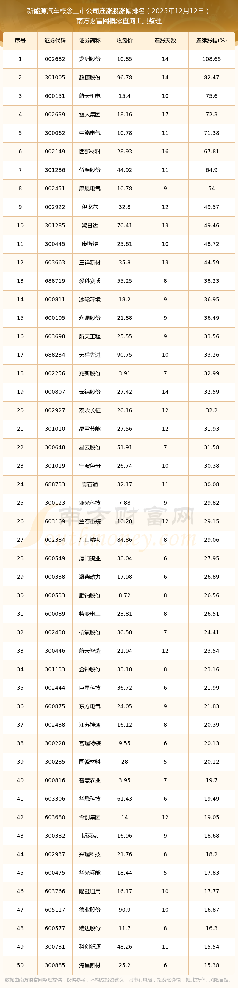 2025年12月12日新能源汽車(chē)概念上市公司連漲股漲幅排名